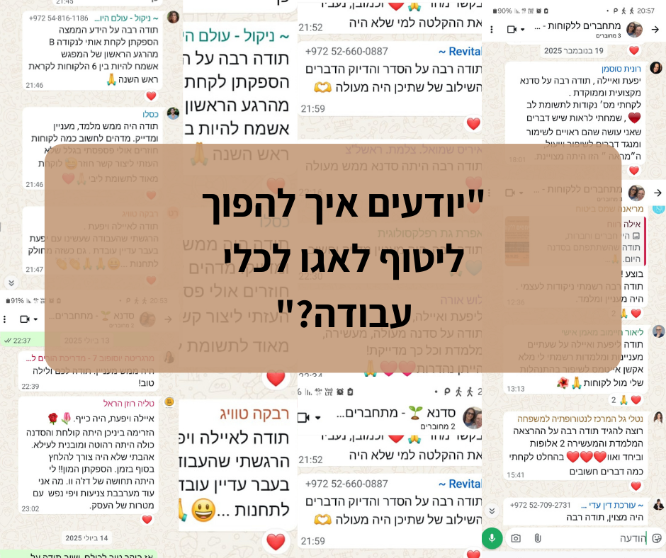 צילומי המסך האלו הם הודעות שקיבלנו ממשתתפים בסדנאות הקודמות. הן דוגמה חיה לאופן שבו משוב הופך לכלי עבודה: כשלומדים להקשיב למה שהלקוחות אומרים (ולמה שהם לא), פתאום מבינים בדיוק מה צריך לשמר, מה כדאי לשפר, ואיפה נמצא הכסף שפשוט חיכה שנרים אותו.